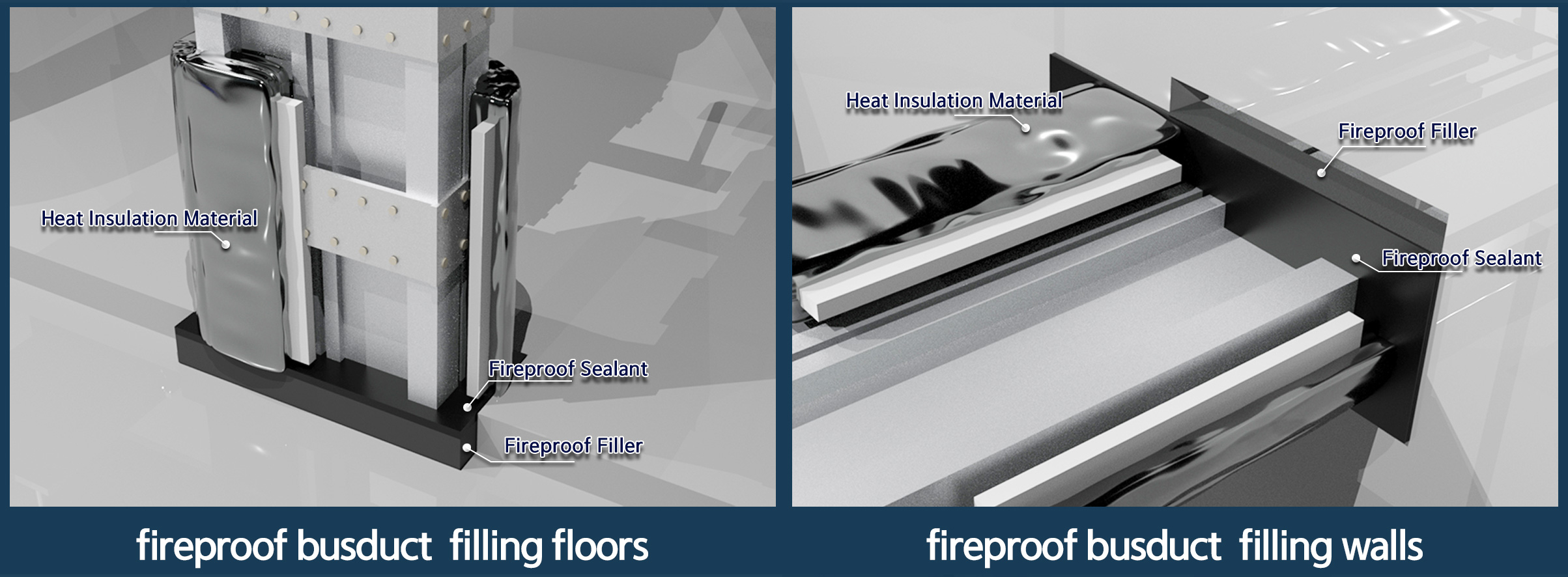 This is a fireproof filling structure system designed to prevent the spread of fire through walls or floors where busducts penetrate within fire compartments