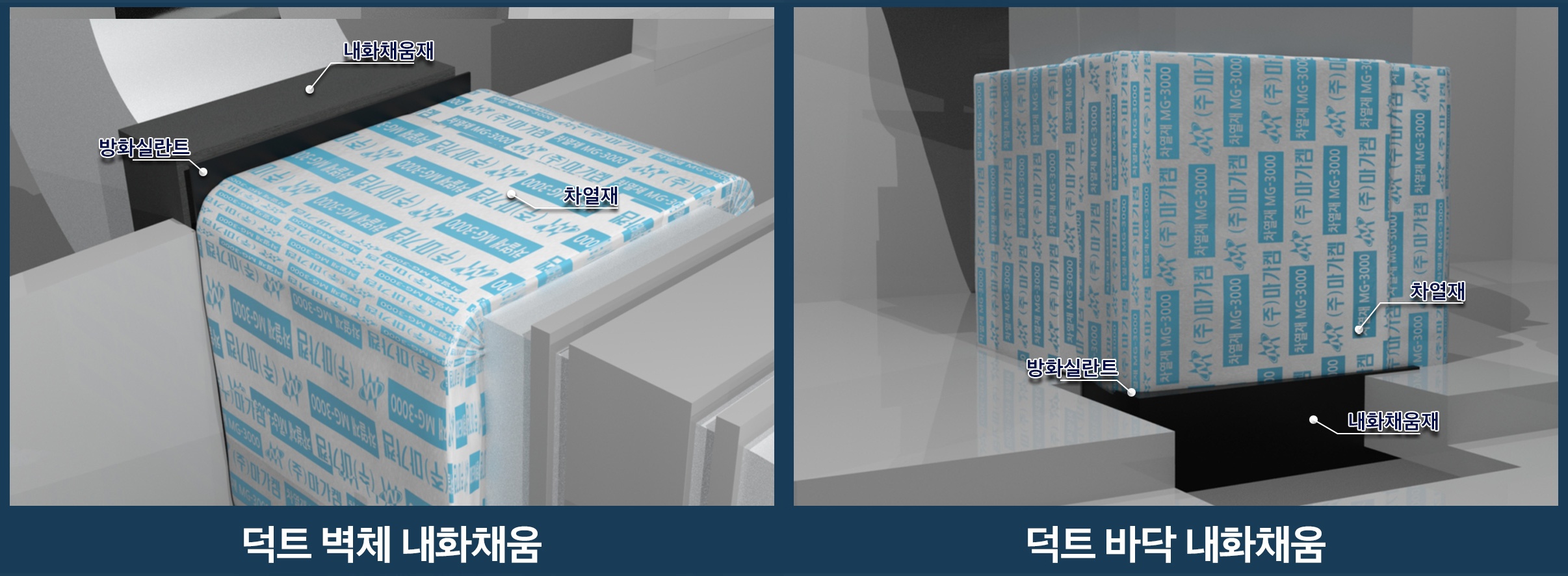 방화구획 내에서 덕트가 관통하는 벽체 또는 바닥부로 화재가 확산되는 것을 방지하기 위한 내화채움구조시스템이다.