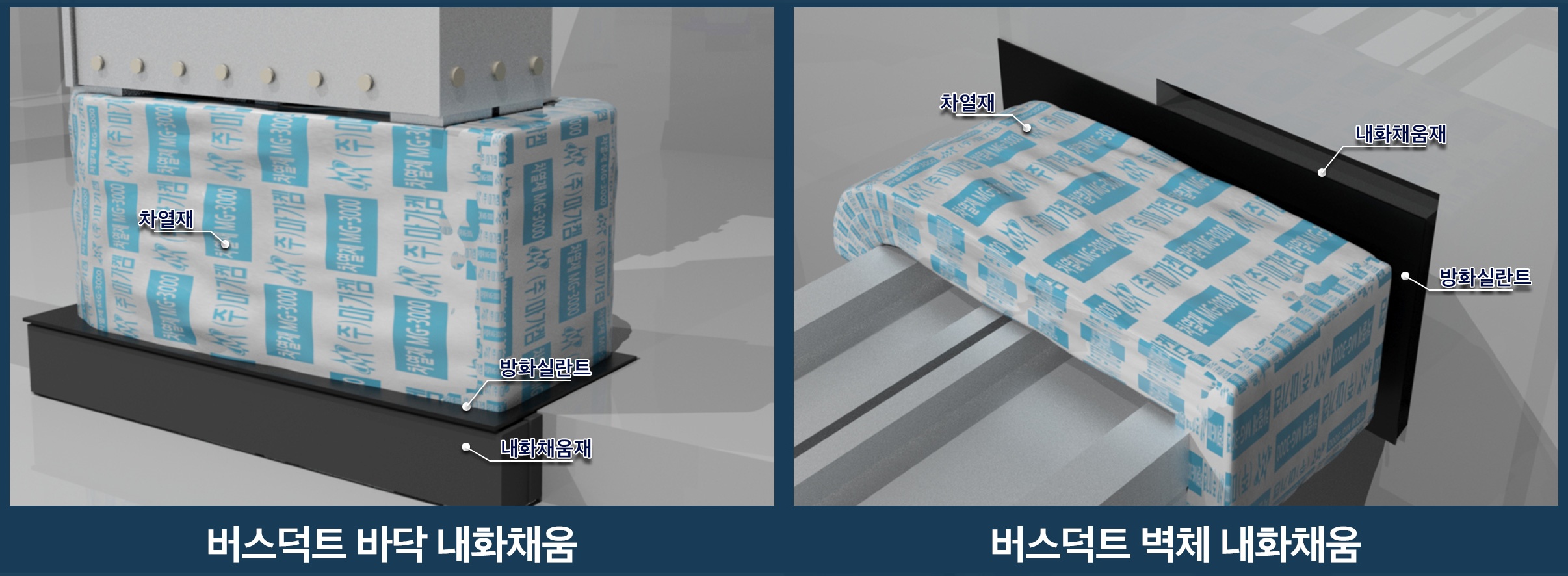 방화구획 내에서 버스덕트가 관통하는 벽체 또는 바닥부로 화재가 확산되는 것을 방지하기 위한 내화채움구조시스템이다.