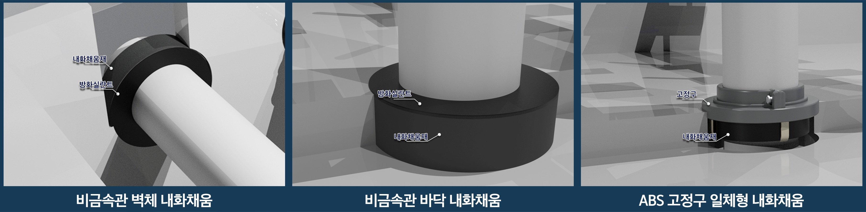 방화구획 내에서 비금속소재관이 관통하는 벽체 또는 바닥부로 화재가 확산되는 것을 방지하기 위한 내화채움구조시스템이다.